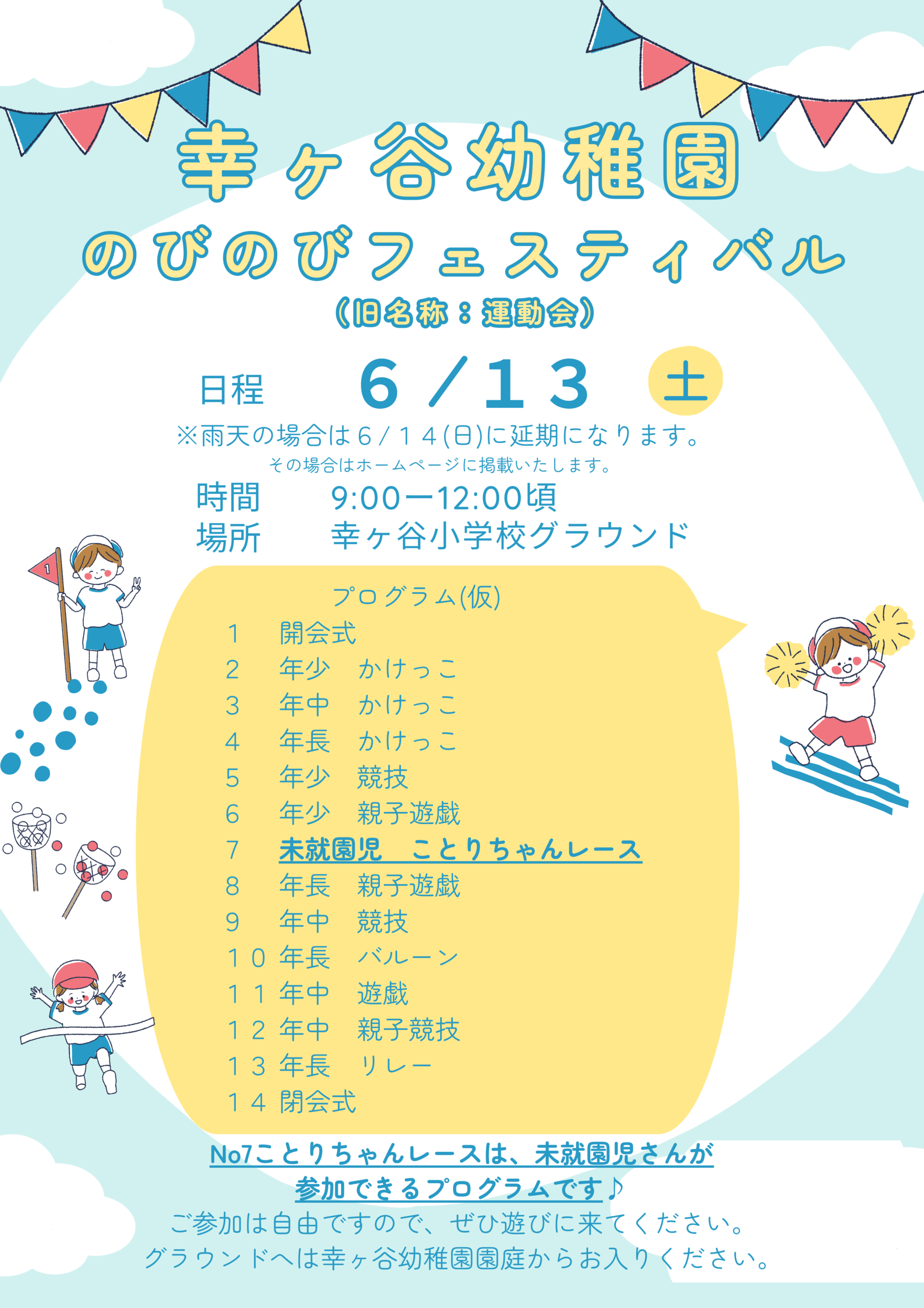 6月13日(土)、幸ヶ谷小学校グラウンドにて「のびのびフェスティバル(旧:運動会)」を開催します。在園のお子さんたちが元気いっぱい走ったり、踊ったり——そんな様子をぜひ見にいらしてください。